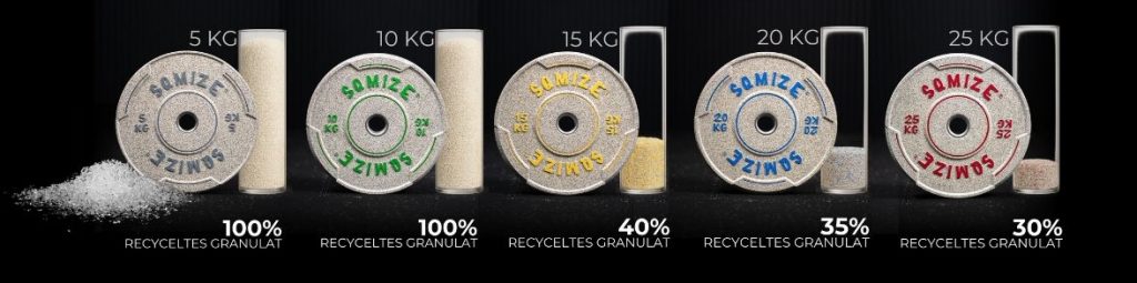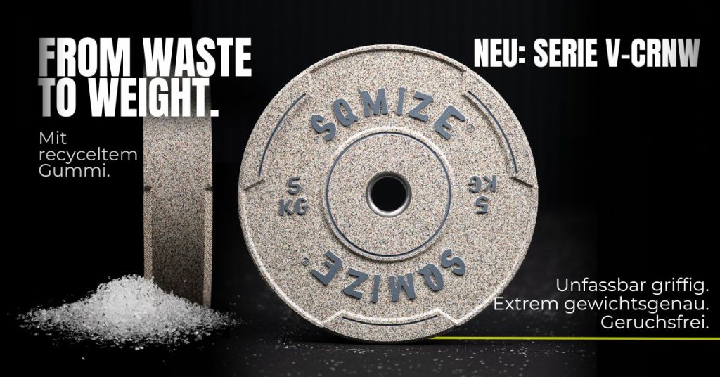 Anders als herkömmliche Bumper Plates bestehen die SQMIZE® V-CRNW Scheiben je nach Gewichtseinheit zu 30–100 % aus recyceltem Material. Damit setzt diese Linie ein klares Statement: Fitness 🏋️‍♂️ und Umweltschutz 🌿 gehen Hand in Hand.